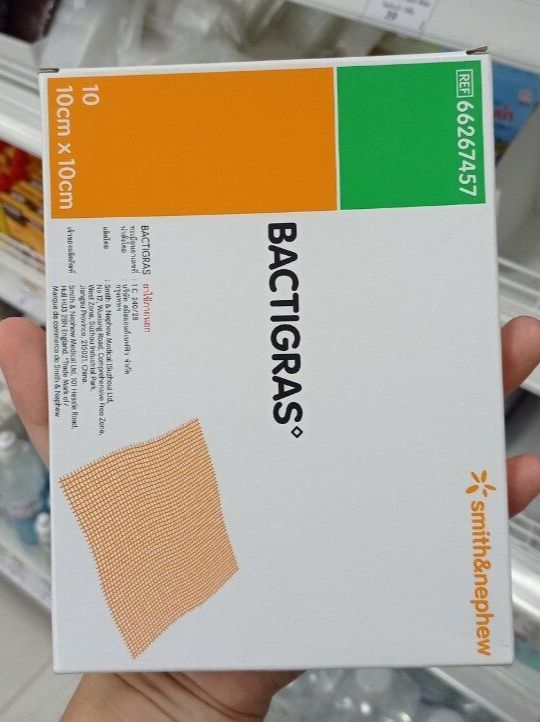 **สินค้ามีพร้อมส่ง** BACTIGRAS 10 CM X 10 CM GAUZE ผ้าก๊อซ 1 กล่องรายละเอียดผ้าก็อซ BACTIGRAS SMITH&NEPHEW 15×20 cm ผ้าก๊อซที่ชุบด้วย Soft Paraffin B.P. และน้ำยาฆ่าเชื้อที่ประกอบด้วยยา 0.5% Chlorhexidine Acetate (milled) B.P.ใช้ปิดแผลป้องกันการติดเชื้อในรายผ่าตัดและเป็นแผลตามผิวหนังทั่วๆไป , แผลถลอก , ไฟไหม้ , น้ำร้อนลวกวิธีใช้ใช้ผ้าก๊อซ 1 แผ่นปิดบนแผลที่ทำความสะอาดแล้ว- ขนาดสินค้า : 10 x 10 ซม.- ขนาดบรรจุ : 10 แผ่น / กล่อง