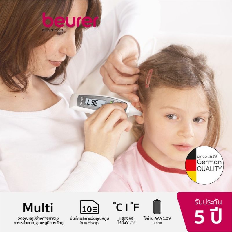 Beurer Multi-function thermometer FT65เครื่องวัดอุณหภูมิแบบมัลติฟังก์ชันรับประกัน 5 ปีสัญลักษณ์โหมดวัดอุณหภูมิแสดงการวัดอุณหภูมิทางหูแสดงการวัดอุณหภูมิทางหน้าผากแสดงการวัดอุณหภูมิวัตถุวัดอุณหภูมิร่างกายทางหู/ทางหน้าผาก, อุณหภูมิของวัตถุแสดงผลได้ทั้ง °C / °Fบันทึกผลการวัดอุณหภูมิได้ 10 ครั้งล่าสุดถ่าน AAA 1.5V (2 ก้อน)ขนาด 38.2 x 138 x 46.5 มม.ฆพ.1200/2563