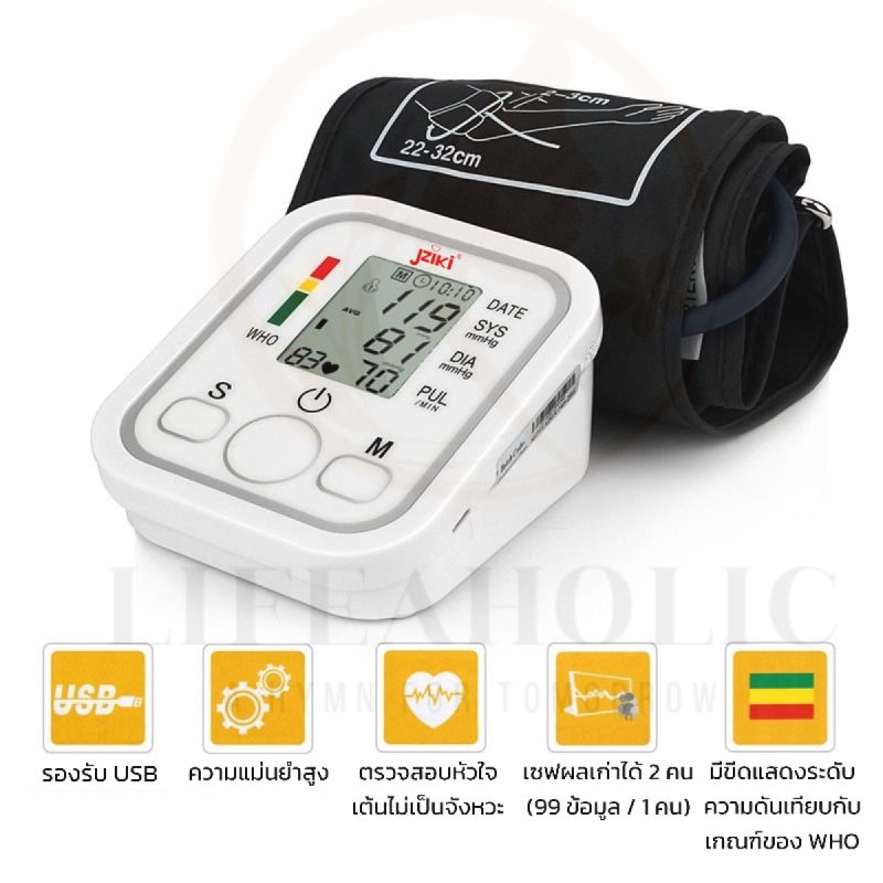 ⚡คุณสมบัติและฟังค์ชันหลัก⚡- ของแท้ 100% จากแบรนด์ Jziki ใหม่ล่าสุด (โปรดระวังของลอกเลียนแบบ ของแท้ต้องมีโลโก้ของแบรนด์ jziki บนตัวเครื่องเท่านั้น) ล็อตผลิตล่าสุุด (กันยายน 2565) รับตรงจากโรงงาน- ความแม่นยำสูงเทียบเท่าอุปกรณ์ในโรงพยาบาล- มาตรฐานการผลิตระดับสากลและผ่านการรับรองโดย CE (ยุโรป), TUV (ISO13485), RoHS, FDA (อ.ย.อเมริกา) (ข้อมูลจากผู้ผลิต)- หน้าจอดิจิตอล ตัวเลขใหญ่ ชัดเจน อ่านง่าย- รุ่นใหม่ล่าสุดตรงจากโรงงาน ใช้ชิปรุ่นอัพเกรดเพื่อค่าความดันโลหิตที่แม่นยำยิ่งขึ้นขึ้น- จ่ายไฟผ่านสาย USB หรือแบตเตอรี่ AAA 4 ก้อน (ร้านมีแถมในกล่องให้ทั้ง 2 อย่างนะคะ ☺️)- สามารถเรียกดูประวัติค่าวัดก่อนหน้าได้ 99 ข้อมูล/1 คน สูงสุด 2 คน รวม 198 ข้อมูล)- สำหรับรอบแขนตั้งแต่ 22-32 ซม.- มีเกณฑ์มาตรฐาน 3 สีของ WHO (องค์การอนามัยโลก) ให้อ้างอิงเพื่อตรวจสอบความเสี่ยงของระดับความดันโลหิตของผู้วัด- น้ำหนักเบา มีกระเป๋าให้ใส่ พกพาง่ายไปได้ทุกหนทุกแห่ง- มีคู่มือแถมให้ทุกกล่อง (**สามารถทักแชทมาถามร้านได้ตลอดเกี่ยวกับวิธีและปัญหาการใช้งาน**)- แถมฟรีทุกออเดอร์‼️ กระเป๋าเก็บเครื่อง + สาย USB + แบตเตอรี่ AAA รวม 4 ก้อน