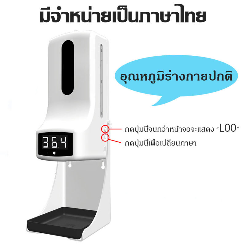 K9 Proรุ่นใหม่ 2021 2 in 1 ในเครื่องเดียวเครื่องวัดอุณหภูมิ พร้อม พ่นสเปรย์ อัตโนมัติ โดยมีถังบรรจุของเหลวหรือแอลกอฮอล์ขนิดน้ำได้ถึง 1000 mlวัดอุณหภูมิได้แม่นยำ และ เร็วขึ้น กว่า รุ่น K9 ธรรมดามีฐานรองตัวเครื่องและถาดน้ำทิ้ง เพื่อกันละอองน้ำ จากหัวพ่นสเปรย์ อัตโนมัติ สามารถติดตั้ง ยึดติดผนัง , วางบนพื้นทั่วไป , ติดตั้งบนขาตั้ง (แถมขาตั้ง ปรับสูง 2 เมตร) สะดวกใช้งานและการเคลื่อนย้ายคุณสมบัติ:-ให้ความแม่นยำสูง มีเซ็นเซอร์อุณหภูมิอินฟราเรด,วัดได้อย่างรวดเร็วและแม่นยำ- รองรับการเปลี่ยนหน่วยองศาเซลเซียส (C) และองศาฟาเรนไฮต์ (F)- เซนเซอร์แม่นยำสูง ตอบสนองเร็ว เชื่อถือได้เรื่องประสิทธิภาพ- ความแม่นยำ +/- 0.2°C (34~45°C เปิดเครื่องก่อนใช้งาน 30 นาที)- รองรับการตั้งค่าอุณหภูมิ ที่ต้องการเตือนด้วยเสียงและสีไฟ LED- ระยะห่างการวัด 5 ซม. ~ 10 ซม.- สภาพแวดล้อมในการใช้งาน 10°C~40°C (แนะนำ ใช้งานในร่ม 15°C~35°C)- หน้าจอแสดงผลขนาดใหญ่พร้อมบอกอุณหภูมิได้ชัดเจน- ระบบประหยัดพลังงานปลุกตัวเองอัตโนมัติเมื่อมีการใช้งาน- จอแสดงผลอัจฉริยะประหยัดพลังงานอัตโนมัติ Wake-up ฟังก์ชั่น แสดงผล แบบ ดิจิตอล- Built-in ถัง 1000ml ด้านข้างใช้การออกแบบที่โปร่งใส เพื่อดูปริมาณของเหลวด้วยสายตาได้- ปริมาตรความจุของเหลวหรือแอลกอฮอล์ขนิดน้ำ ถังสูงสุด 1 ลิตร (1000ml) ใช้งานได้ยาวนาน- ปรับระดับปริมาณ และเวลาที่แอลกอออล์ พ่นสเปรย์ อัตโนมัติ ออกจากเครื่อง 0.1 ถึง 2.0 วินาที- มีฐานและถาดซึ่งสามารถวางบนโต๊ะ หรือ ใช้กับขาตั้ง- สามารถปรับระดับเสียงเตือนได้- รองรับ 15ภาษา: ไทย อังกฤษ จีน เกาหลี ฯลฯ- น้ำหนักเบา เคลื่อนย้ายสะดวก- แหล่งจ่ายไฟฟ้าผ่านสาย USB DC 5V หรือ ถ่าน AA 4ก้อนลักษณะ :1.วัดอุณหภูมิ: 32 ~ 122 °F (0 ~ 50 °C)2.อุณหภูมิแวดล้อม: 41 ~ 113 °F (10 ~ 40 °C)3.ความถูกต้อง: ± 0.2 °F (34 ~ 45 °C)4.วัดระยะทาง: 5ซม.~ 10ซม.5.วัดเวลา: 500มิลลิวินาที6.กำลังไฟ: 5W7.แหล่งจ่ายไฟ: USB DC 5V หรือ แบตเตอรี่ AA 4ก้อน8.วิธีการติดตั้ง: โต๊ะ , ติดผนัง , ขาตั้ง (แถมขาตั้ง ปรับสูง 2 เมตร)