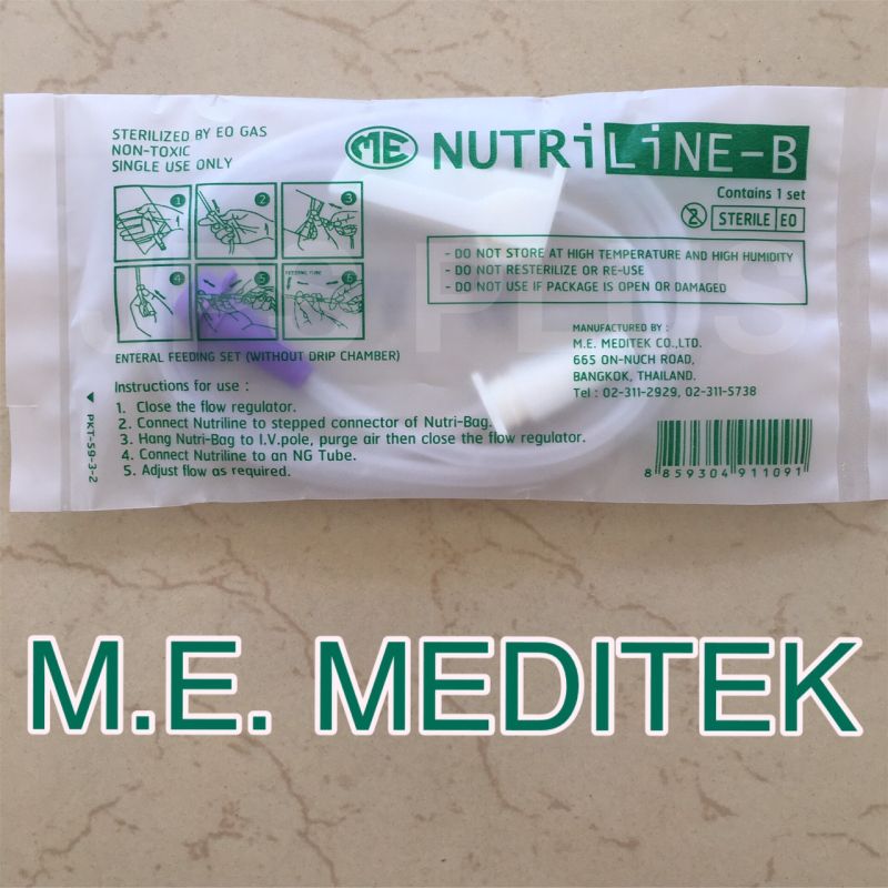 สายต่อถุงให้อาหาร Nutri Line B ( 10 เส้น ) แบบไม่มีกระเปาะ ส่งของทุกวัน ตัดรอบ 14.00 น. หลังจากเวลานี้ส่งของวันถัดไป ถ้าลูกค้าต้องการใบกำกับภาษีเต็มรูปแบบ กรุณาแจ้งให้ร้านทราบทางช่องแชท พร้อมแจ้งรายละเอียดให้ครบถ้วนในการออกใบกำกับภาษี ‼️เฉพาะลูกค้าที่ต้องการและแจ้งความจำนงทางแชทเท่านั้น‼️ ทางร้านส่งใบกำกับภาษีพร้อมกับสินค้าเท่านั้น -ผลิตด้วยพลาสติกประเภท PVC (Medical grade) -มีความยาวรวมตลอดทั้งชุด ประมาณ 100 ซม. -ปลายสายมีข้อต่อพร้อมฝาปิดสำหรับใช้กับข้อต่อชนิดเดือย ของถุงให้อาหาร -มีรางรอกควบคุมการไหลของอาหารได้ -ปลายสายมีข้อต่อชนิดเดือย ใช้ต่อกับ NG ได้ -ฆ่าเชื้อด้วยเอทธิลีนออกไซด์ (ETO)
