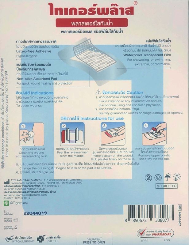 Tigerplast Transparent Waterproof พลาสเตอร์ปิดแผล ชนิดฟิมล์ใสกันน้ำ มีผ้าก๊อซข้างใน มีหลายขนาดให้เลือก*** ตัวเลือกสินค้า● ยี่ห้อ Tigerrplast 1.1.9×4 cm. (WF) – 10 แผ่น/กล่อง (พอดีนิ้วมือ)2. 2.5×7.2 cm. (WS) – 10 แผ่น/กล่อง3. 6×7 cm. (W1) − 3 แผ่น/กล่อง4. 6×10 cm. (W2) − 2 แผ่น/กล่อง5. 8×10 cm. (W3) − 2 แผ่น/กล่อง 6. 10×12 cm. (W4) − 2 แผ่น/กล่อง ● ยี่ห้อ SOS Plus1. 2.5×5.6 cm. (T1) – 10 แผ่น/กล่อง2. 3×7 cm. (T1-B) – 9 แผ่น/กล่อง3. 6×7 cm. (T2) − 3 แผ่น/กล่อง4. 6×10 cm. (T3) − 2 แผ่น/กล่อง5. 8×8 cm. (T2X2) − 3 แผ่น/กล่อง6. 12×12 cm. (T3X3) − 2 แผ่น/กล่อง7. 9×15 cm. (T2X4) − 2 แผ่น/กล่อง8. 10×20 cm. (T Series) − 2 แผ่น/กล่อง9. 10×25 cm. (T4) − 2 แผ่น/กล่อง——————–*** คุณสมบัติ✓ กันน้ำ แปะอาบน้ำ ว่ายน้ำได้✓ ฟิล์มบาง ใส แนบกับผิว✓ แผ่นซึมซับ พร้อมใยกันแผลติด✓ กาวอะคริลิค อ่อนโยน——————–*** ข้อบ่งใช้ปิดแผลจากของมีคม แผลถลอก แผลไฟไหม้ น้ำร้อนลวก แผลเย็บ แผลหลังผ่าตัด——————–*** วิธีใช้1. ทำความสะอาดแผล ซับให้แห้ง2. ลอกแผ่นปิดหน้ากาวออก ปิดพลาสเตอร์บนแผล3. ลูบพลาสเตอร์ให้แนบสนิทกับผิว4. ลอกแผ่นพลาสติกด้านบนออก โดยดึงจากแถบชมพู——————–*** คำเตือน> หากแพ้ ควรหยุดใช้และปรึกษาแพทย์ทันที > เด็กใช้ ควรอยู่ในการดูแลของผู้ใหญ่ > เก็บในที่แห้งและเย็น