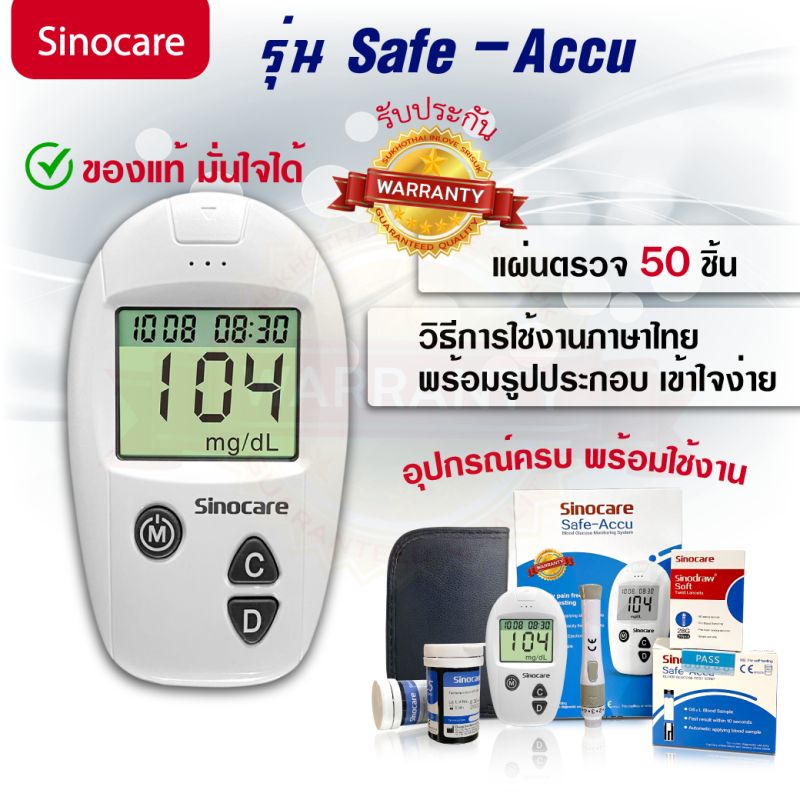 ❤ เครื่องวัดน้ำตาล Sinocare รุ่น Safe-Accu ❤SINOCARE Safe-Accu Blood Glucose monitoring system สินค้าพร้อมส่งจากไทย ‼️ ส่งเร็ว ไม่ต้องรอนาน อุปกรณ์ครบชุดพร้อมใช้งานได้ทันที แอดมินคอยบริการ สอบถามได้ ไม่ต้องกังวล❤ รายละเอียดสินค้า▶ ช่วงการวัดของตัวเครื่อง : 20-600 mg / dL ▶ ปริมาณเลือด: 0.6μl (ใช้เลือดเพียงนิดเดียว) ▶ ระยะเวลาในการอ่านค่า : 10 วินาที ▶ อุณหภูมิในการทำงานของเครื่อง: 10 ℃ถึง 35 ℃ ▶ มีหน่วยความจำภายใน บันทึกผลอัตโนมัติ 200 ชุดข้อมูล พร้อมด้วยวันที่และเวลา ▶ แหล่งจ่ายไฟ: ถ่านกลม 1 ก้อน▶ เครื่องปิดอัตโนมัติเมื่อไม่ได้ใช้งาน▶ ปุ่มเลื่อนแผ่นตรวจ▶ มีประกันตัวเครื่อง 3 ปี มีปัญหาสอบถามได้ตลอด❤ มาตรฐานสากล ❤❤ รับรองมาตรฐานอย. มั่นใจได้ คุณภาพเดียวกับโรงพยาบาล❤ อุปกรณ์ครบชุด พร้อมใช้งาน▶ ตัวเครื่องวัดน้ำตาล รุ่น Safe-Accu▶ ปากกาเจาะ สามารถปรับได้ 5 ระดับ ตามความต้องการ รูปทรงกะทัดรัด ▶ ถ่านกลม 1 ก้อน (ก่อนใช้งานดึงแผ่นพลาสติกออกก่อนนะคะ) ▶ กระเป๋าพกพาใส่ตัวเครื่อง ▶ อุปกรณ์เสริม ; แผ่นตรวจ 50 ชิ้น และ อุปกรณ์สำหรับใช้กับปากกาเจาะ จำนวน 50 ชิ้น ▶ คู่มือการใช้งาน มีทั้งภาษาอังกฤษและ ภาษาไทย พร้อมรูปประกอบ เข้าใจง่าย แนะนำวัดค่าตอนเช้าก่อนทานอาหารและน้ำ จะได้ค่าที่แม่นยำค่ะ หากใช้อุปกรณ์เสริมหมด ทางร้านมีจำหน่ายแยกอยู่นะคะ ไม่ต้องกังวลเรื่องการหาซื้อค่ะ ทางร้านมีของสต็อกตลอด❤ มีข้อสงสัยด้านการใช้งาน สามารถทักมาสอบถามทางร้านได้ตลอดค่ะ บริการหลังการขายตลอดอายุการใช้งาน❤