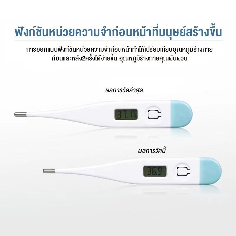 ปรอทวัดไข้ดิจิตัล หน้าจอ LCD นาทีนี้ต้องมีทุกบ้านนะคะ ใช้ได้ทั้งเด็กและผู้ใหญ่วัดได้ทางปาก รักแร้ และทวารหนัก วัดได้แม่นยำ มีเสียงเตือนเมื่อวัดอุณภูมิเรียบร้อย วัดได้ภายใน 1 นาที วัดได้แม่นยำ รวดเร็ว หน้าจอ LCD ขนาดใหญ่มองเห็นชัดเจน ขนาดเล็กกะทัดรัด พกพาสะดวก ถ่านสามารถเปลี่ยนได้****** ****** *******คุณสมบัติของเครื่อง – ใช้วัดอุณหภูมิทางรักแร้ แสดงผลด้วยหน้าจอระบบดิจิตอล รู้ผลรวดเร็วภายใน 1 นาที – ควรปิดเครื่องทุกครั้งเมื่อใช้งานเสร็จ เพื่อถนอมแบตเตอร์รี่ เครื่องจะปิดเองหลังจากผ่านไปประมาณ 8 นาที – ใช้ถ่านกระดุม LR41 – หน้าจอแสดงค่าตัวเลขระบบดิจิตอล – ค่าที่สามารถวัดได้ : 32 – 42 องศาเซลเซียส – ความแม่นยำ : +/- 0.1 องศาเซลเซียส – อุณหภูมิเก็บรักษา : -10 ถึง 60 องศาเซลเซียส – ปลอดภัย ไม่มีส่วนที่เป็นแก้วและปรอทWxLxH 5x8x2 cmวิธีการใช้งาน 1.กดเปิดเครื่อง (จะมีเสียงติ๊ด 1 ครั้ง) 2.นำปลายปรอทวัดที่ซอกรักแร้หรือทางช่องปาก 3.มีเสียงเตือนเมื่อทำการวัดค่าเสร็จสิ้น (เครื่องจะดังติ๊ดถี่ๆ หลายๆ ครั้ง) 4.กดปิดเครื่อง 1 ครั้ง (จะมีเสียงติ๊ด 1 ครั้ง) – เครื่องจะปิดเองหลังจากผ่านไปประมาณ 8 นาที แต่ควรกดปิดเครื่องทุกครั้งเพื่อยืดอายุแบตเตอร์รี่ – ถ้าถ่านหมด หน้าจอจะเปิดไม่ติด หรือติดแบบเบลอๆ** สัญลักษณ์ Loํc ไม่ใช่สัญลักษณ์ที่แสดงว่าถ่านหมด แต่เป็นสัญลักษณ์ที่แสดงว่าเครื่องได้ reset ความจำทั้งหมดเป็น 0 และเริ่มวัดอุณหภูมิได้การใช้งานและการดูแลรักษา ถ้ามีการใช้วัดอย่างต่อเนื่อง ทุกครั้งที่เริ่มการใช้งานใหม่ให้ทำความสะอาดปลายที่วัดหรือบริเวณที่เป็นโลหะ โดยใช้ผ้าหรือสำลีชุบแอลกอฮอล์เช็ด และใช้ผ้าแห้งเช็ดอีกครั้งก่อนใช้งานไม่ได้ใช้เพื่อ ติดตามโรค หรือ อาการบาดเจ็บ #ปรอทวัดไข้ดิจิตัล