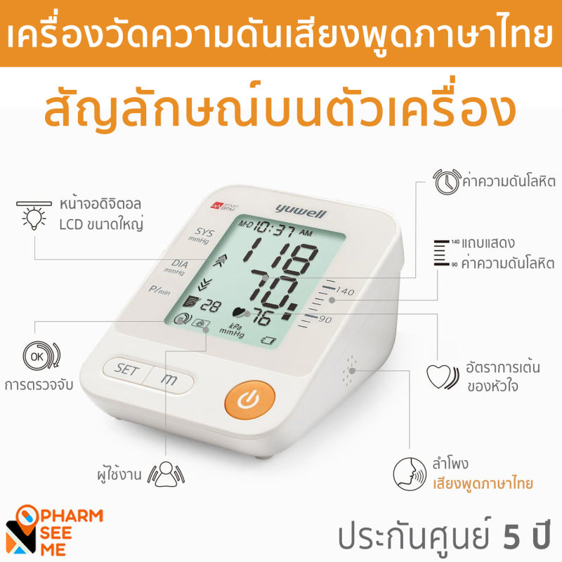 สินค้ามีพร้อมส่ง จัดส่งจริง ส่งไว รับประกันผลิตภัณฑ์ของแท้ 100%ถ่ายจากสินค้าจริง ลูกค้าจะได้รับสินค้าตรงปกสามารถออกใบกำกับภาษี / ใบเสร็จรับเงินได้ (แจ้งทางแชท)สนใจสินค้าหรือสอบถามรายละเอียด ทักแชทร้านค้าได้เลยมีบริการหลังการขายและศูนย์บริการสินค้ารับประกันตัวเครื่อง 5 ปี จากการใช้งานปกติหน้าจอแสดงผลแบบดิจิตอล อ่านค่าได้ง่ายสามารถใช้ได้ตั้งแต่รอบแขน 22-45 ซม.ตัวเครื่อง และเมนูเป็นภาษาอังกฤษหน้าจอแสดงค่าความดันขณะหัวใจบีบตัว(SYS) ค่าความดันขณะหัวใจคลายตัว(DIA) และอัตราการเต้นของหัวใจ(P/min)มีสัญลักษ์แจ้งเตือน การเต้นผิดปกติของหัวใจมีเสียงพูดภาษาไทย และสามารถปรับระดับเสียงได้แสดงค่าความดันเฉลี่ยล่าสุดได้ 3 ครั้ง และบันทึกค่าได้ 60 ครั้งช่วงที่วัดได้ ความดัน 60-230 มม.ปรอท ชีพจร 40-200 ครั้งต่อนาทีความแม่นยำของค่าความดัน ±3 มม.ปรอท ความแม่นยำของชีพจร ±5% ของค่าที่วัดได้ฆพ.626/2563